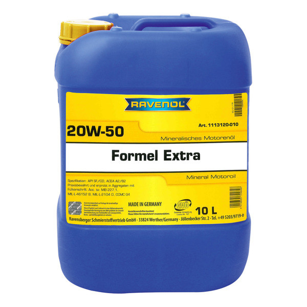 RAVENOL Formel Extra SAE 20W-50 – минералдык мотор майы, жеңил бензин жана дизель кыймылдаткычтары үчүн, турбонаддуву менен жана ансыз, ошондой эле коммерциялык автотранспорт үчүн өндүрүлгөн.