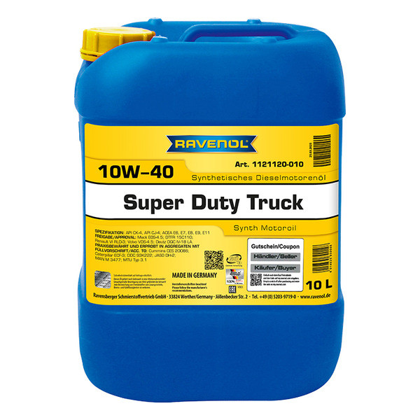 RAVENOL SDT Super Duty Truck SAE 10W-40 - синтетическое высоколегированное легкотекучее моторное масло с низкозольным пакетом присадок (Low SAPS). Специально разработано для круглогодичного использования в высоконагруженных дизельных двигателях грузовых автомобилей. Предназначено для турбодизельных двигателей класса EURO 2, EURO 3, EURO 4, EURO 5 и EURO 6 в сочетании с дизельным топливом с содержанием серы до 500 ppm.